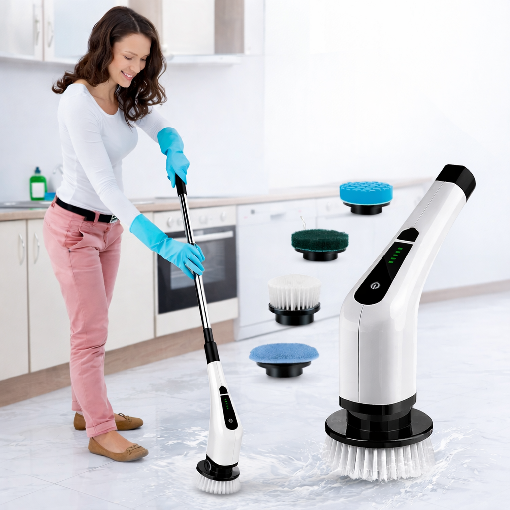 SCRUBIX Gracias a su cabeza rotativa, la suciedad se desprende sin que tú tengas que frotar fuerte. Los distintos cabezales se adaptan a cada superficie. El mango largo te permite limpiar de pie. Así limpias más rápido y sin cansarte.
